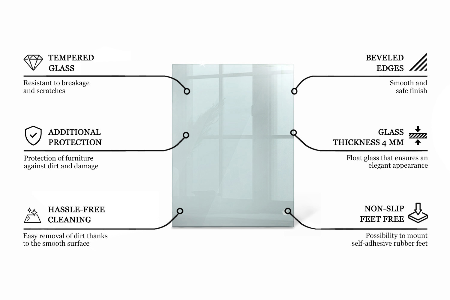 Bring subtle elegance to your interior with a rectangular transparent glass top. The clear surface gives the space visual lightness while ensuring high durability and resistance for everyday use. The transparent glass table top in transparent is perfect as a dining table surface, desk, or protective furniture cover. Crafted from tempered glass, it is tough, easy to maintain, and keeps its clear look for years. Its simple form fits great with modern and industrial styles. If you value functionality, this glass top for furniture is the perfect practical solution for your kitchen or home office.